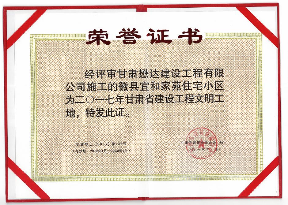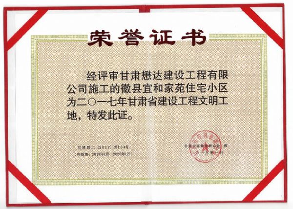 日前,由甘肅懋達(dá)建設(shè)工程有限公司承建的徽縣宜和家苑住宅小區(qū)項(xiàng)目、天水市成紀(jì)新家園棚戶區(qū)改造項(xiàng)目一期工程五標(biāo)段項(xiàng)目在2017年全省建筑業(yè)“三優(yōu)一文明”評(píng)選中喜獲“2017年甘肅省建設(shè)工程文明工地”榮譽(yù)稱號(hào)。